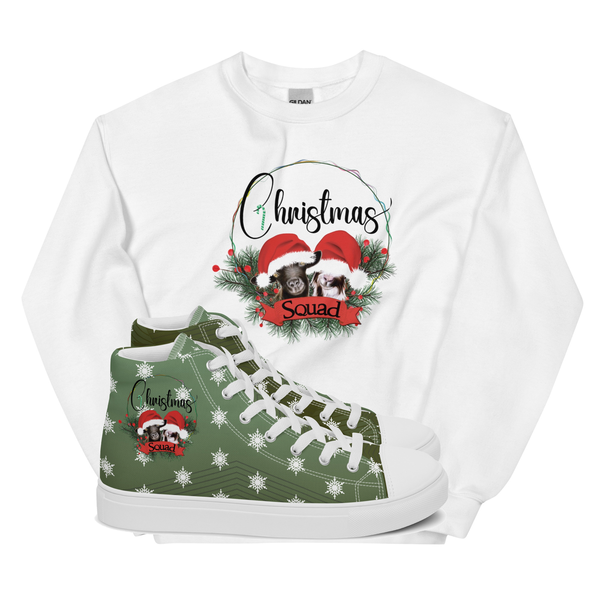 ✨ Matching high-top sneakers with snowflake patterns and the Christmas Squad design — a festive statement piece that turns every outing into a holiday celebration.