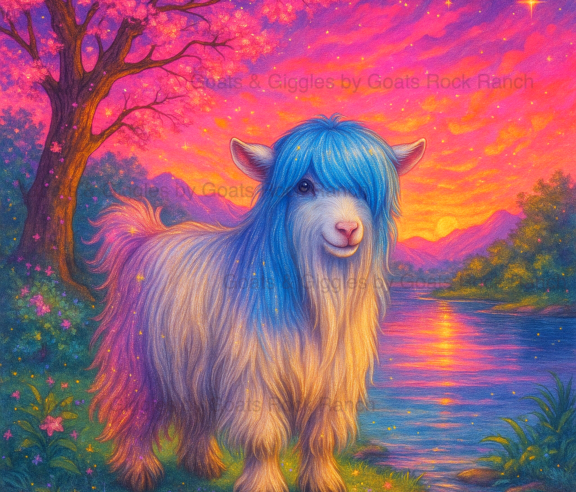 Celebrate sparklecore style with our Aurora Hair Fantasy tumbler. The silky Mini Fainting Goat’s long, flowing hair cascades in shades of lavender, aqua, rose gold, and cream, shimmering under a magical sky. Surrounded by glowing foliage and soft sunset colors, this tumbler blends dreamy vibes with everyday function. A 20 oz skinny tumbler that’s both practical and enchanting.